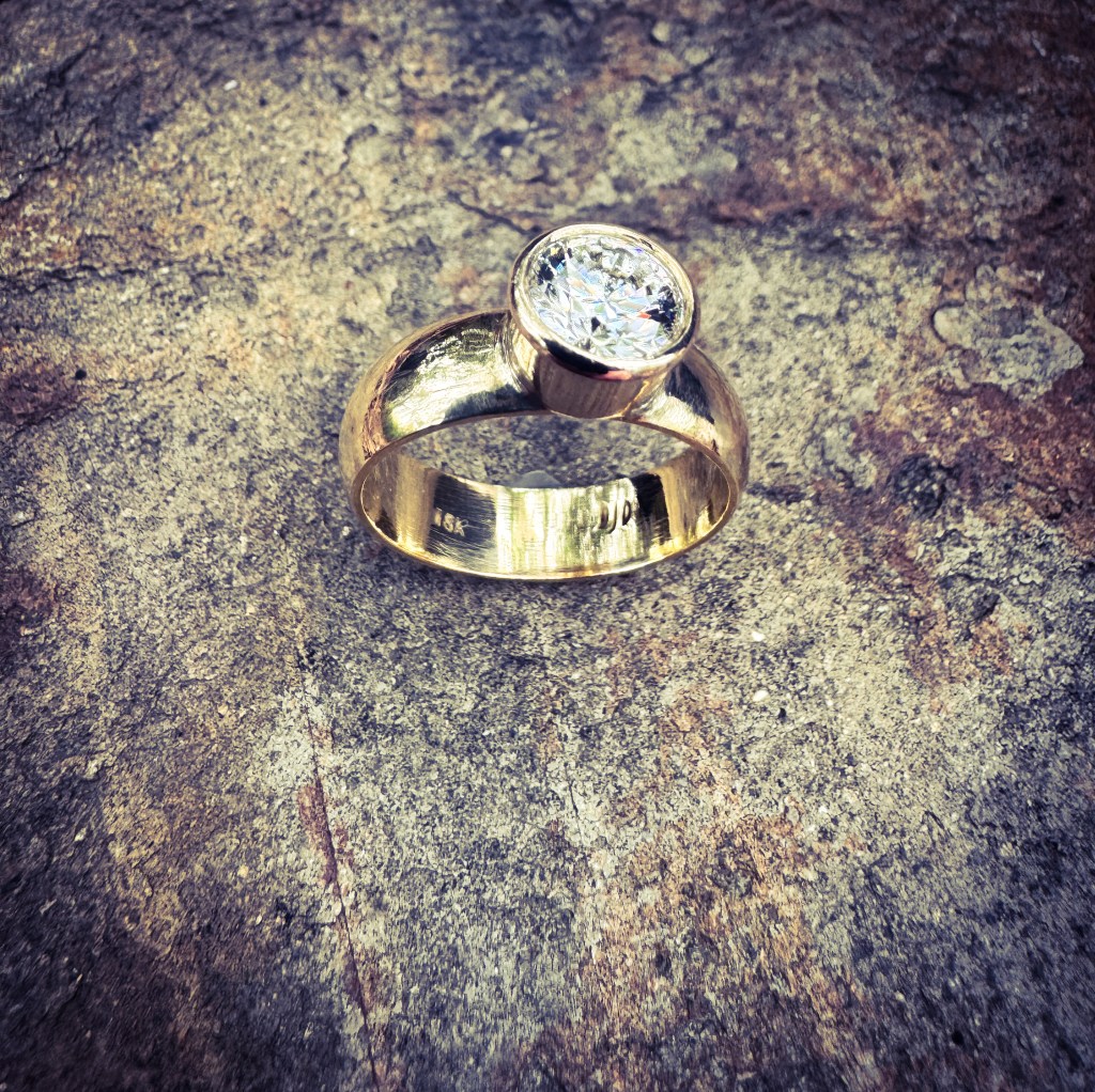 A handcrafted, 18k recycled, yellow gold ring, with a 1.25 Carat natural diamond, Color: G, Clarity: VS1, Cut: Excellent. A truly beautiful stone.