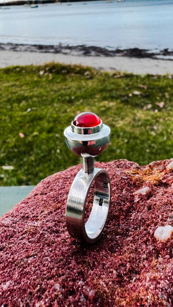 Some recent work coming out, here is a new Sterling Silver, hollow form cocktail ring, with a 10 MM AA grade natural Hessonite Garnet, with a steel wool finish.