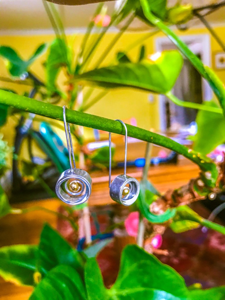 Handcrafted spiral sterling silver and 14kt gold earrings.