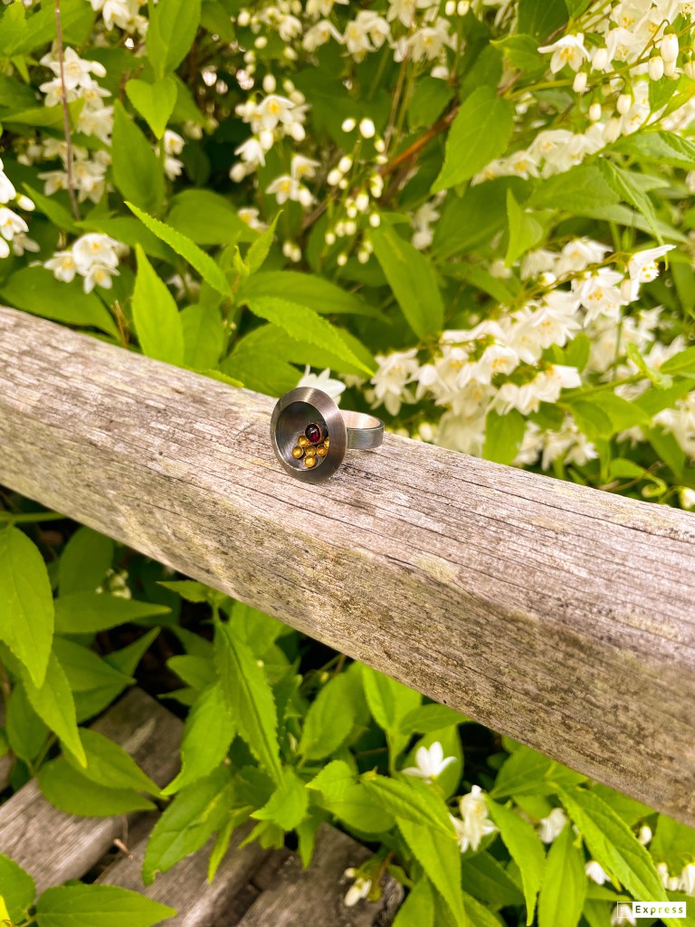 A semi hollow, sterling silver ring, set with a 5mm Amethyst and 14Kt gold flying saucers.